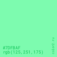 Цвет #7DFBAF в цветовой модели RGB обозначается тремя октетами (125, 251, 175) в десятичном формате и #7DFBAF в шестнадцатиричном (hex) формате, которые являются интенсивностью красного 125 (hex 7D), интенсивность зелёного 251 (hex FB) и интенсивность синего 175 (hex AF).