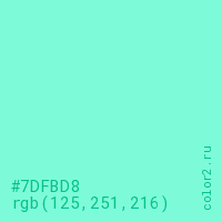 Цвет #7DFBD8 в цветовой модели RGB обозначается тремя октетами (125, 251, 216) в десятичном формате и #7DFBD8 в шестнадцатиричном (hex) формате, которые являются интенсивностью красного 125 (hex 7D), интенсивность зелёного 251 (hex FB) и интенсивность синего 216 (hex D8).