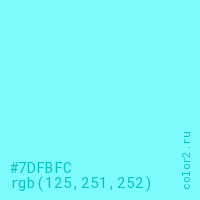 Цвет #7DFBFC в цветовой модели RGB обозначается тремя октетами (125, 251, 252) в десятичном формате и #7DFBFC в шестнадцатиричном (hex) формате, которые являются интенсивностью красного 125 (hex 7D), интенсивность зелёного 251 (hex FB) и интенсивность синего 252 (hex FC).