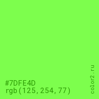 Цвет #7DFE4D в цветовой модели RGB обозначается тремя октетами (125, 254, 77) в десятичном формате и #7DFE4D в шестнадцатиричном (hex) формате, которые являются интенсивностью красного 125 (hex 7D), интенсивность зелёного 254 (hex FE) и интенсивность синего 77 (hex 4D).