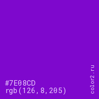 Цвет #7E08CD в цветовой модели RGB обозначается тремя октетами (126, 8, 205) в десятичном формате и #7E08CD в шестнадцатиричном (hex) формате, которые являются интенсивностью красного 126 (hex 7E), интенсивность зелёного 8 (hex 08) и интенсивность синего 205 (hex CD).