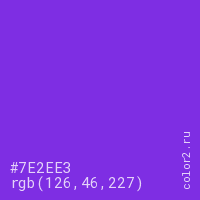 Цвет #7E2EE3 в цветовой модели RGB обозначается тремя октетами (126, 46, 227) в десятичном формате и #7E2EE3 в шестнадцатиричном (hex) формате, которые являются интенсивностью красного 126 (hex 7E), интенсивность зелёного 46 (hex 2E) и интенсивность синего 227 (hex E3).