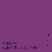 Цвет #7E397C в цветовой модели RGB обозначается тремя октетами (126, 57, 124) в десятичном формате и #7E397C в шестнадцатиричном (hex) формате, которые являются интенсивностью красного 126 (hex 7E), интенсивность зелёного 57 (hex 39) и интенсивность синего 124 (hex 7C).