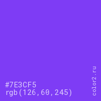 Цвет #7E3CF5 в цветовой модели RGB обозначается тремя октетами (126, 60, 245) в десятичном формате и #7E3CF5 в шестнадцатиричном (hex) формате, которые являются интенсивностью красного 126 (hex 7E), интенсивность зелёного 60 (hex 3C) и интенсивность синего 245 (hex F5).