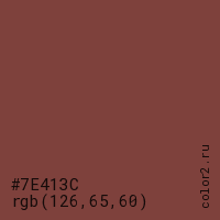 Цвет #7E413C в цветовой модели RGB обозначается тремя октетами (126, 65, 60) в десятичном формате и #7E413C в шестнадцатиричном (hex) формате, которые являются интенсивностью красного 126 (hex 7E), интенсивность зелёного 65 (hex 41) и интенсивность синего 60 (hex 3C).