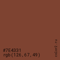 Цвет #7E4331 в цветовой модели RGB обозначается тремя октетами (126, 67, 49) в десятичном формате и #7E4331 в шестнадцатиричном (hex) формате, которые являются интенсивностью красного 126 (hex 7E), интенсивность зелёного 67 (hex 43) и интенсивность синего 49 (hex 31).