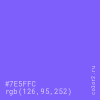 Цвет #7E5FFC в цветовой модели RGB обозначается тремя октетами (126, 95, 252) в десятичном формате и #7E5FFC в шестнадцатиричном (hex) формате, которые являются интенсивностью красного 126 (hex 7E), интенсивность зелёного 95 (hex 5F) и интенсивность синего 252 (hex FC).