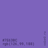 Цвет RGB(126, 99, 188) в процентом отношении количества цвета состоит из 49.4% красного (red), 38.8% зелёного (green) и 73.7% синего (blue).