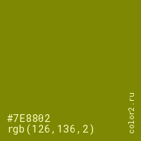 Цвет #7E8802 в цветовой модели RGB обозначается тремя октетами (126, 136, 2) в десятичном формате и #7E8802 в шестнадцатиричном (hex) формате, которые являются интенсивностью красного 126 (hex 7E), интенсивность зелёного 136 (hex 88) и интенсивность синего 2 (hex 02).