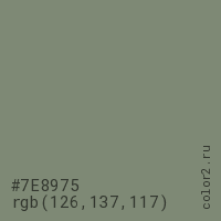 Цвет #7E8975 в цветовой модели RGB обозначается тремя октетами (126, 137, 117) в десятичном формате и #7E8975 в шестнадцатиричном (hex) формате, которые являются интенсивностью красного 126 (hex 7E), интенсивность зелёного 137 (hex 89) и интенсивность синего 117 (hex 75).