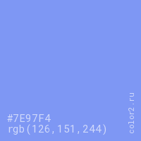 Цвет #7E97F4 в цветовой модели RGB обозначается тремя октетами (126, 151, 244) в десятичном формате и #7E97F4 в шестнадцатиричном (hex) формате, которые являются интенсивностью красного 126 (hex 7E), интенсивность зелёного 151 (hex 97) и интенсивность синего 244 (hex F4).