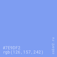 Цвет #7E9DF2 в цветовой модели RGB обозначается тремя октетами (126, 157, 242) в десятичном формате и #7E9DF2 в шестнадцатиричном (hex) формате, которые являются интенсивностью красного 126 (hex 7E), интенсивность зелёного 157 (hex 9D) и интенсивность синего 242 (hex F2).