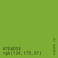 Цвет #7EAD33 в цветовой модели RGB обозначается тремя октетами (126, 173, 51) в десятичном формате и #7EAD33 в шестнадцатиричном (hex) формате, которые являются интенсивностью красного 126 (hex 7E), интенсивность зелёного 173 (hex AD) и интенсивность синего 51 (hex 33).