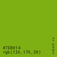 Цвет #7EB014 в цветовой модели RGB обозначается тремя октетами (126, 176, 20) в десятичном формате и #7EB014 в шестнадцатиричном (hex) формате, которые являются интенсивностью красного 126 (hex 7E), интенсивность зелёного 176 (hex B0) и интенсивность синего 20 (hex 14).