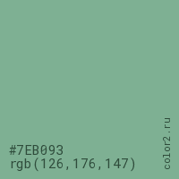 Цвет #7EB093 в цветовой модели RGB обозначается тремя октетами (126, 176, 147) в десятичном формате и #7EB093 в шестнадцатиричном (hex) формате, которые являются интенсивностью красного 126 (hex 7E), интенсивность зелёного 176 (hex B0) и интенсивность синего 147 (hex 93).