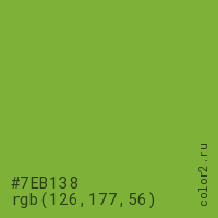 Цвет #7EB138 в цветовой модели RGB обозначается тремя октетами (126, 177, 56) в десятичном формате и #7EB138 в шестнадцатиричном (hex) формате, которые являются интенсивностью красного 126 (hex 7E), интенсивность зелёного 177 (hex B1) и интенсивность синего 56 (hex 38).