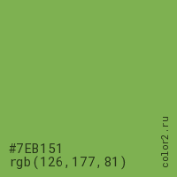 Цвет #7EB151 в цветовой модели RGB обозначается тремя октетами (126, 177, 81) в десятичном формате и #7EB151 в шестнадцатиричном (hex) формате, которые являются интенсивностью красного 126 (hex 7E), интенсивность зелёного 177 (hex B1) и интенсивность синего 81 (hex 51).