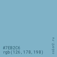 Цвет #7EB2C6 в цветовой модели RGB обозначается тремя октетами (126, 178, 198) в десятичном формате и #7EB2C6 в шестнадцатиричном (hex) формате, которые являются интенсивностью красного 126 (hex 7E), интенсивность зелёного 178 (hex B2) и интенсивность синего 198 (hex C6).