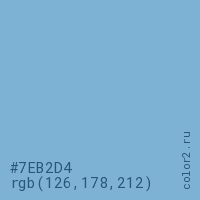 Цвет #7EB2D4 в цветовой модели RGB обозначается тремя октетами (126, 178, 212) в десятичном формате и #7EB2D4 в шестнадцатиричном (hex) формате, которые являются интенсивностью красного 126 (hex 7E), интенсивность зелёного 178 (hex B2) и интенсивность синего 212 (hex D4).