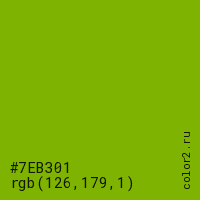 Цвет #7EB301 в цветовой модели RGB обозначается тремя октетами (126, 179, 1) в десятичном формате и #7EB301 в шестнадцатиричном (hex) формате, которые являются интенсивностью красного 126 (hex 7E), интенсивность зелёного 179 (hex B3) и интенсивность синего 1 (hex 01).