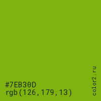 Цвет #7EB30D в цветовой модели RGB обозначается тремя октетами (126, 179, 13) в десятичном формате и #7EB30D в шестнадцатиричном (hex) формате, которые являются интенсивностью красного 126 (hex 7E), интенсивность зелёного 179 (hex B3) и интенсивность синего 13 (hex 0D).