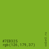 Цвет #7EB325 в цветовой модели RGB обозначается тремя октетами (126, 179, 37) в десятичном формате и #7EB325 в шестнадцатиричном (hex) формате, которые являются интенсивностью красного 126 (hex 7E), интенсивность зелёного 179 (hex B3) и интенсивность синего 37 (hex 25).