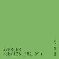 Цвет #7EB663 в цветовой модели RGB обозначается тремя октетами (126, 182, 99) в десятичном формате и #7EB663 в шестнадцатиричном (hex) формате, которые являются интенсивностью красного 126 (hex 7E), интенсивность зелёного 182 (hex B6) и интенсивность синего 99 (hex 63).