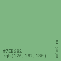 Цвет #7EB682 в цветовой модели RGB обозначается тремя октетами (126, 182, 130) в десятичном формате и #7EB682 в шестнадцатиричном (hex) формате, которые являются интенсивностью красного 126 (hex 7E), интенсивность зелёного 182 (hex B6) и интенсивность синего 130 (hex 82).