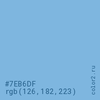 Цвет #7EB6DF в цветовой модели RGB обозначается тремя октетами (126, 182, 223) в десятичном формате и #7EB6DF в шестнадцатиричном (hex) формате, которые являются интенсивностью красного 126 (hex 7E), интенсивность зелёного 182 (hex B6) и интенсивность синего 223 (hex DF).