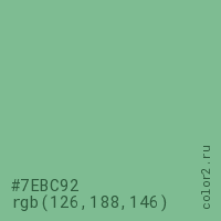 Цвет #7EBC92 в цветовой модели RGB обозначается тремя октетами (126, 188, 146) в десятичном формате и #7EBC92 в шестнадцатиричном (hex) формате, которые являются интенсивностью красного 126 (hex 7E), интенсивность зелёного 188 (hex BC) и интенсивность синего 146 (hex 92).