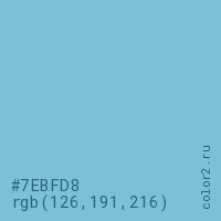 Цвет #7EBFD8 в цветовой модели RGB обозначается тремя октетами (126, 191, 216) в десятичном формате и #7EBFD8 в шестнадцатиричном (hex) формате, которые являются интенсивностью красного 126 (hex 7E), интенсивность зелёного 191 (hex BF) и интенсивность синего 216 (hex D8).