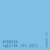 Цвет #7EBFE3 в цветовой модели RGB обозначается тремя октетами (126, 191, 227) в десятичном формате и #7EBFE3 в шестнадцатиричном (hex) формате, которые являются интенсивностью красного 126 (hex 7E), интенсивность зелёного 191 (hex BF) и интенсивность синего 227 (hex E3).