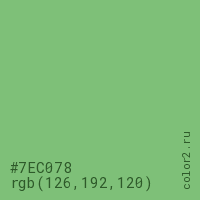 Цвет #7EC078 в цветовой модели RGB обозначается тремя октетами (126, 192, 120) в десятичном формате и #7EC078 в шестнадцатиричном (hex) формате, которые являются интенсивностью красного 126 (hex 7E), интенсивность зелёного 192 (hex C0) и интенсивность синего 120 (hex 78).