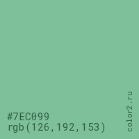 Цвет #7EC099 в цветовой модели RGB обозначается тремя октетами (126, 192, 153) в десятичном формате и #7EC099 в шестнадцатиричном (hex) формате, которые являются интенсивностью красного 126 (hex 7E), интенсивность зелёного 192 (hex C0) и интенсивность синего 153 (hex 99).