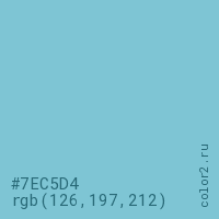Цвет #7EC5D4 в цветовой модели RGB обозначается тремя октетами (126, 197, 212) в десятичном формате и #7EC5D4 в шестнадцатиричном (hex) формате, которые являются интенсивностью красного 126 (hex 7E), интенсивность зелёного 197 (hex C5) и интенсивность синего 212 (hex D4).