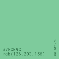 Цвет #7ECB9C в цветовой модели RGB обозначается тремя октетами (126, 203, 156) в десятичном формате и #7ECB9C в шестнадцатиричном (hex) формате, которые являются интенсивностью красного 126 (hex 7E), интенсивность зелёного 203 (hex CB) и интенсивность синего 156 (hex 9C).