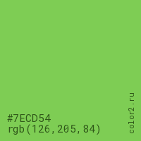 Цвет #7ECD54 в цветовой модели RGB обозначается тремя октетами (126, 205, 84) в десятичном формате и #7ECD54 в шестнадцатиричном (hex) формате, которые являются интенсивностью красного 126 (hex 7E), интенсивность зелёного 205 (hex CD) и интенсивность синего 84 (hex 54).