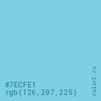 Цвет #7ECFE1 в цветовой модели RGB обозначается тремя октетами (126, 207, 225) в десятичном формате и #7ECFE1 в шестнадцатиричном (hex) формате, которые являются интенсивностью красного 126 (hex 7E), интенсивность зелёного 207 (hex CF) и интенсивность синего 225 (hex E1).