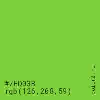 Цвет #7ED03B в цветовой модели RGB обозначается тремя октетами (126, 208, 59) в десятичном формате и #7ED03B в шестнадцатиричном (hex) формате, которые являются интенсивностью красного 126 (hex 7E), интенсивность зелёного 208 (hex D0) и интенсивность синего 59 (hex 3B).