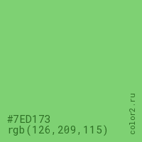 Цвет #7ED173 в цветовой модели RGB обозначается тремя октетами (126, 209, 115) в десятичном формате и #7ED173 в шестнадцатиричном (hex) формате, которые являются интенсивностью красного 126 (hex 7E), интенсивность зелёного 209 (hex D1) и интенсивность синего 115 (hex 73).