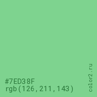 Цвет #7ED38F в цветовой модели RGB обозначается тремя октетами (126, 211, 143) в десятичном формате и #7ED38F в шестнадцатиричном (hex) формате, которые являются интенсивностью красного 126 (hex 7E), интенсивность зелёного 211 (hex D3) и интенсивность синего 143 (hex 8F).