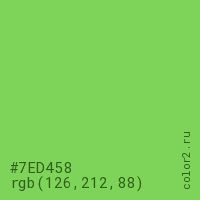 Цвет #7ED458 в цветовой модели RGB обозначается тремя октетами (126, 212, 88) в десятичном формате и #7ED458 в шестнадцатиричном (hex) формате, которые являются интенсивностью красного 126 (hex 7E), интенсивность зелёного 212 (hex D4) и интенсивность синего 88 (hex 58).