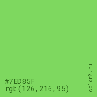 Цвет #7ED85F в цветовой модели RGB обозначается тремя октетами (126, 216, 95) в десятичном формате и #7ED85F в шестнадцатиричном (hex) формате, которые являются интенсивностью красного 126 (hex 7E), интенсивность зелёного 216 (hex D8) и интенсивность синего 95 (hex 5F).