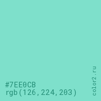 Цвет RGB(126, 224, 203) в процентом отношении количества цвета состоит из 49.4% красного (red), 87.8% зелёного (green) и 79.6% синего (blue).