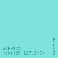 Цвет #7EE3DA в цветовой модели RGB обозначается тремя октетами (126, 227, 218) в десятичном формате и #7EE3DA в шестнадцатиричном (hex) формате, которые являются интенсивностью красного 126 (hex 7E), интенсивность зелёного 227 (hex E3) и интенсивность синего 218 (hex DA).