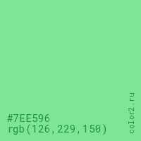 Цвет #7EE596 в цветовой модели RGB обозначается тремя октетами (126, 229, 150) в десятичном формате и #7EE596 в шестнадцатиричном (hex) формате, которые являются интенсивностью красного 126 (hex 7E), интенсивность зелёного 229 (hex E5) и интенсивность синего 150 (hex 96).
