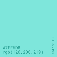 Цвет #7EE6DB в цветовой модели RGB обозначается тремя октетами (126, 230, 219) в десятичном формате и #7EE6DB в шестнадцатиричном (hex) формате, которые являются интенсивностью красного 126 (hex 7E), интенсивность зелёного 230 (hex E6) и интенсивность синего 219 (hex DB).