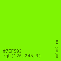 Цвет #7EF503 в цветовой модели RGB обозначается тремя октетами (126, 245, 3) в десятичном формате и #7EF503 в шестнадцатиричном (hex) формате, которые являются интенсивностью красного 126 (hex 7E), интенсивность зелёного 245 (hex F5) и интенсивность синего 3 (hex 03).