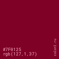 Цвет #7F0125 в цветовой модели RGB обозначается тремя октетами (127, 1, 37) в десятичном формате и #7F0125 в шестнадцатиричном (hex) формате, которые являются интенсивностью красного 127 (hex 7F), интенсивность зелёного 1 (hex 01) и интенсивность синего 37 (hex 25).