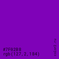 Цвет #7F02B8 в цветовой модели RGB обозначается тремя октетами (127, 2, 184) в десятичном формате и #7F02B8 в шестнадцатиричном (hex) формате, которые являются интенсивностью красного 127 (hex 7F), интенсивность зелёного 2 (hex 02) и интенсивность синего 184 (hex B8).